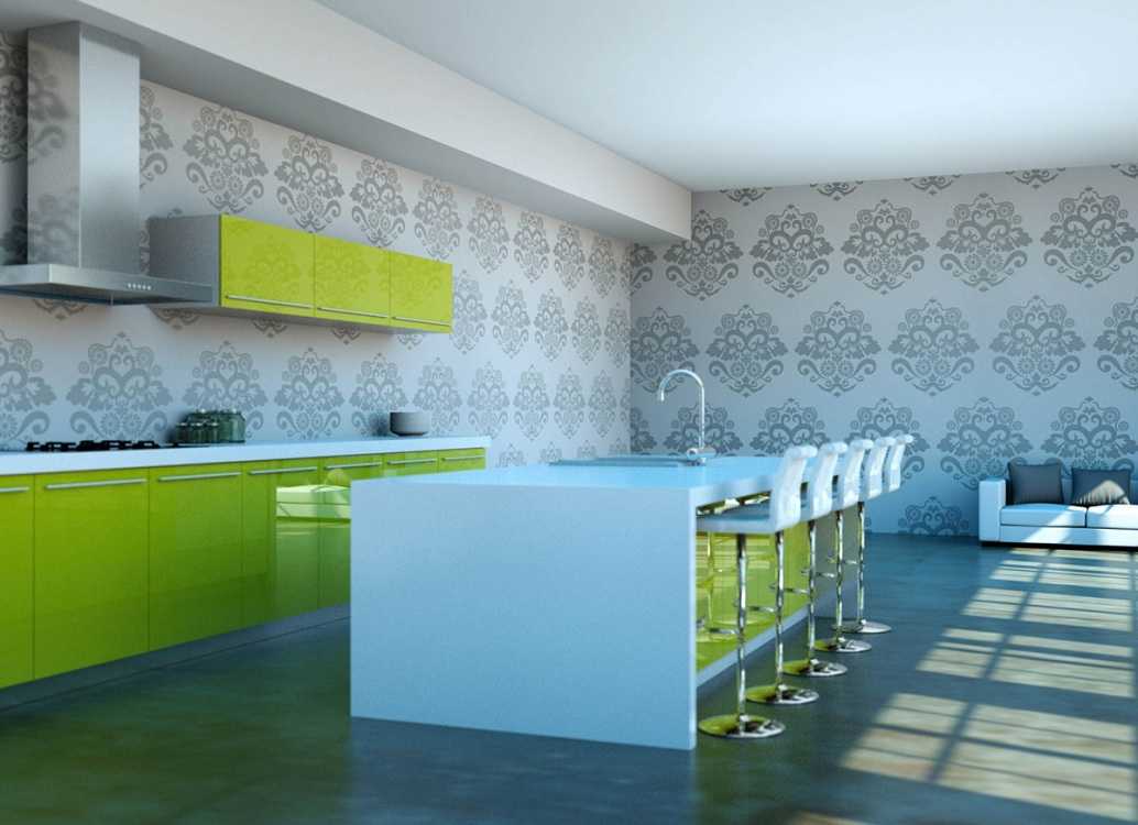 - в габаритных помещениях – наклеивание на стены очень крупных элементов светло-зеленого оттенка;