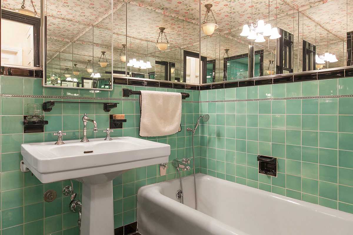 - Комбинация сочных зеленых, желтых, золотых и светлых элементов позволит оформить ванную в стиле ар-деко. Для него также хорошо подойдут нефритовые и малахитовые тона.