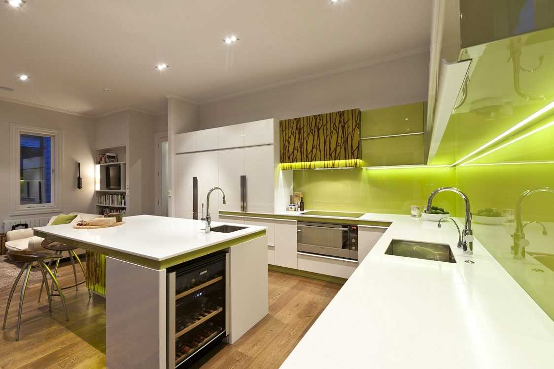 Зеленый цвет в данном интерьере может присутствовать в некоторых элементах оформления — например, отлично будет смотреться кухонный фартук, выполненный в виде мозаики из зеленого стекла либо керамики.